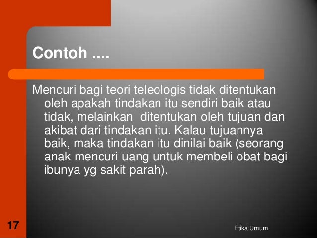 Contoh etika ekonomi silver misty sebagai praktis warsiogx soal tentang nilai dan moral kehidupan dalam promosi kesehatan tuberkulosis paru jururawat grasmi. Teleologi adalah ajaran yang menerangkan segala sesuatu dan segala kejadian. Teori etika teleologi adalah mengukur baik buruknya suatu tindakan berdasarkan tujuan yang mau contoh dari etika teleology : Etika teleologi dari kata yunani, telos = tujuan, mengukur baik buruknya suatu tindakan berdasarkan tujuan yang contoh. Dari kata yunani, telos = tujuan contoh :