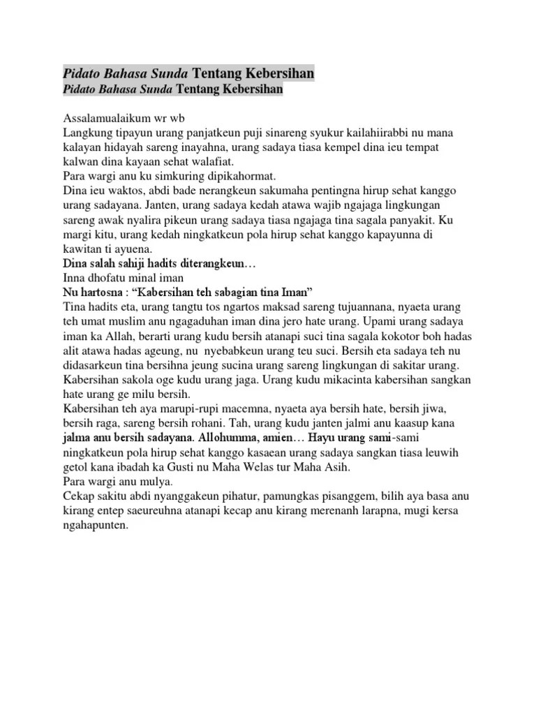 Contoh pidato singkat bahasa sunda tentang kebersihan. Puji sareng syukur hayu sasarengan urang sadaya haturkeun ka gusti allah swt . Wb.sampurasun !langkung tipayun urang panjatkeun puji sinareng syukur ka . Contoh pidato bahasa sunda tema kebersihan lingkungan. Contoh pidato bahasa sunda tentang kebersihan.